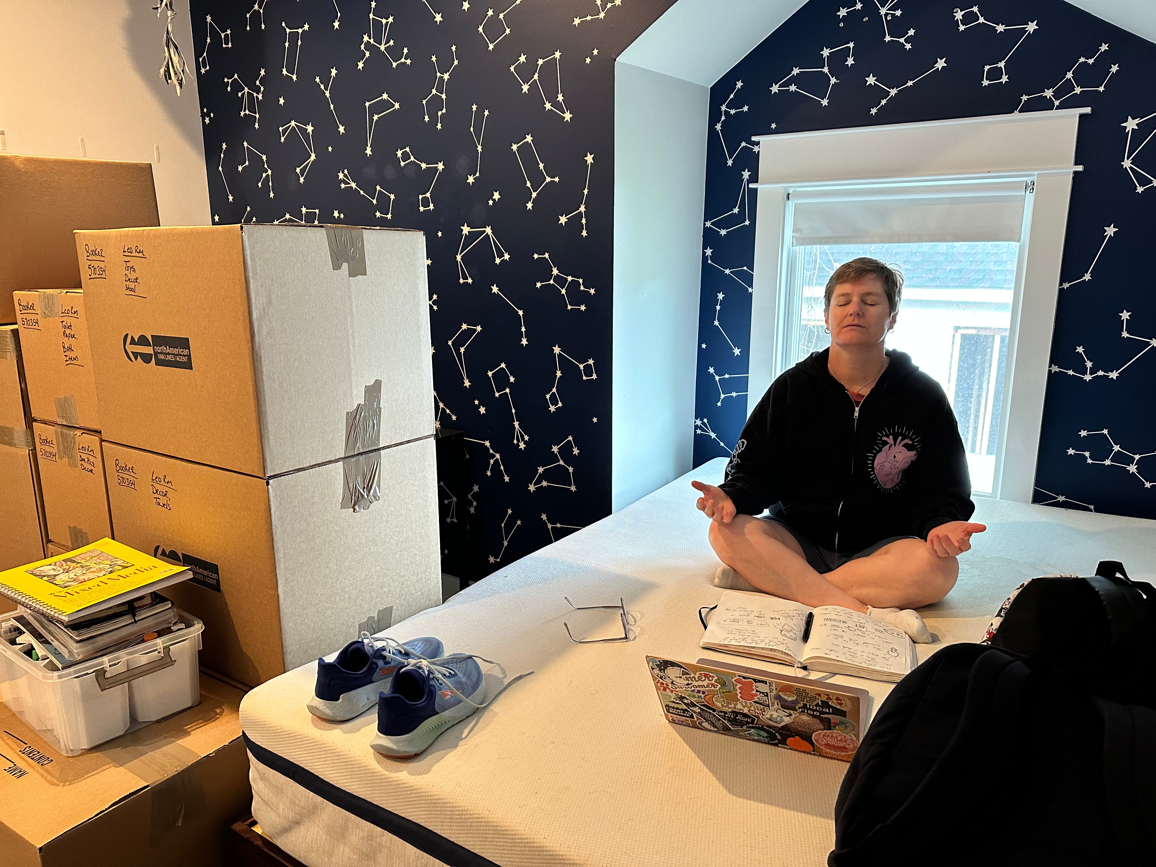 Who was this version of me—coloring and breathing and learning—while strangers wrapped my dishes in paper and boxed up my books?
